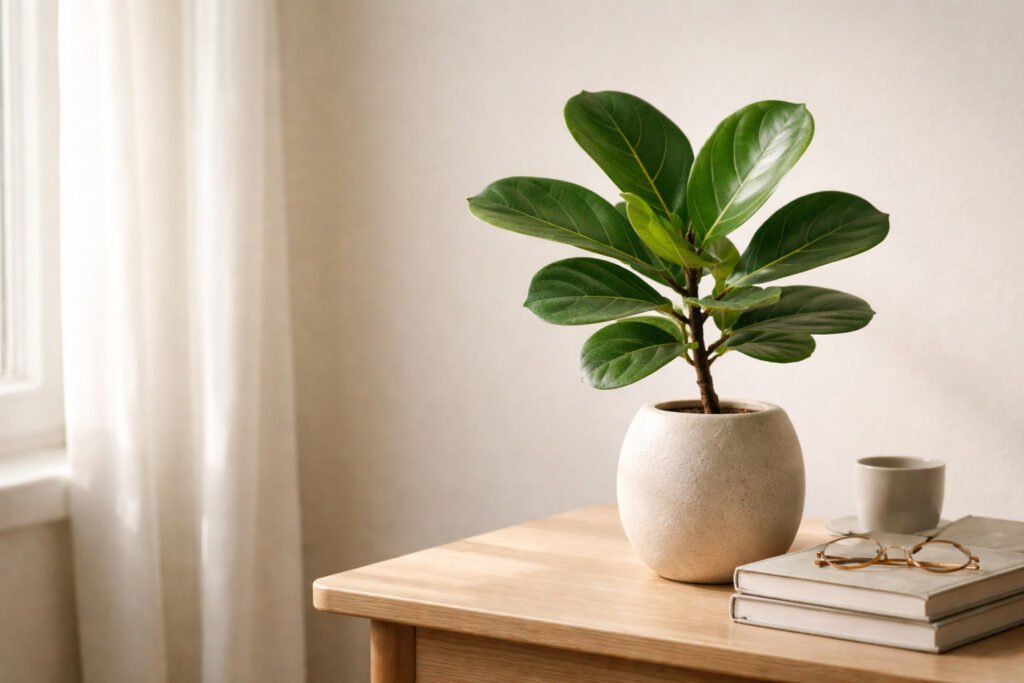 - Destaque: A Ficus Lyrata Bambino é uma versão menor da famosa árvore de interiores, perfeita para cantos de salas pequenas. Ela traz estrutura sem dominar o ambiente.
