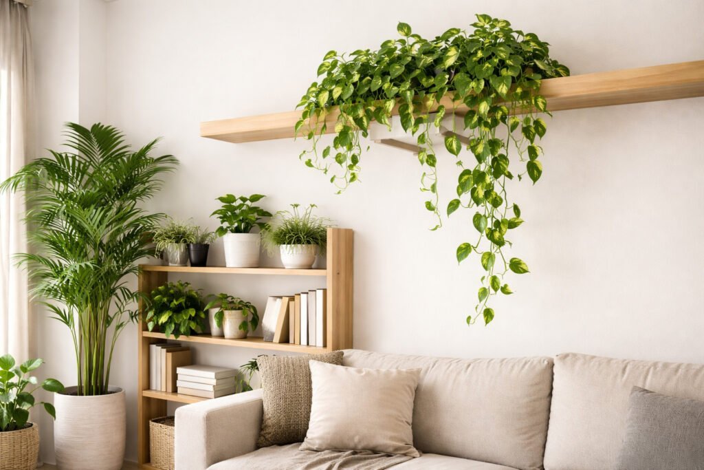 Prateleiras altas com plantas que “cascateiam” criam uma moldura natural para as paredes. O uso de suportes de macramê ou ganchos minimalistas no teto adiciona profundidade ao ambiente sem ocupar espaço útil no piso.