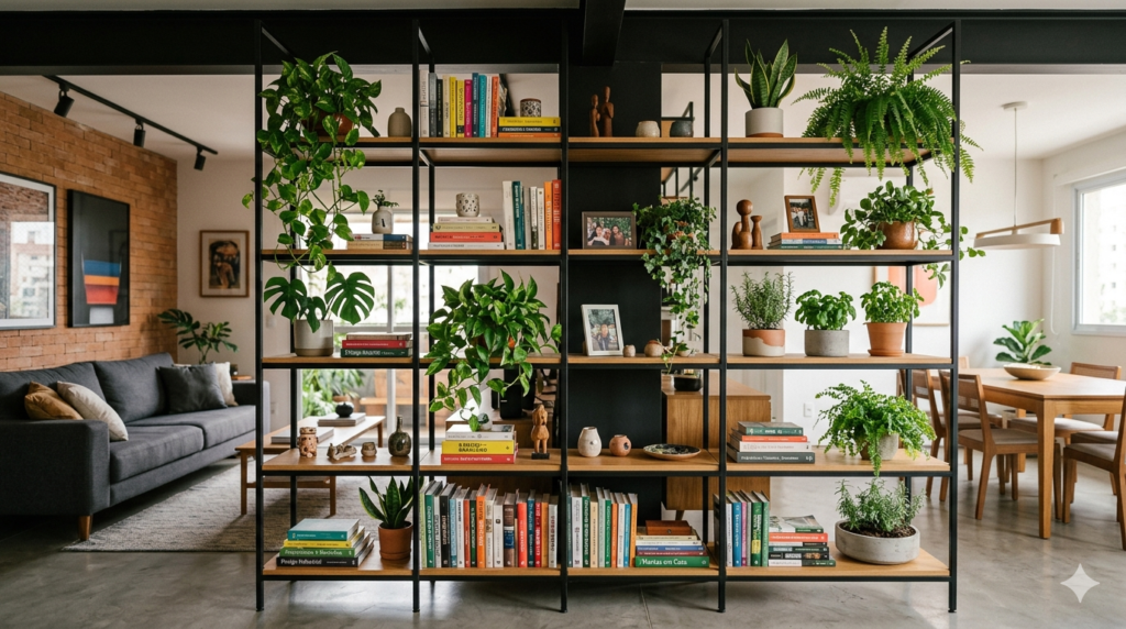 O design moderno oferece peças criadas especificamente para o cultivo. Estantes vazadas que funcionam como divisórias de ambientes são perfeitas para acomodar vasos de ervas, permitindo que a luz atravesse o móvel e alimente as plantas de ambos os lados.