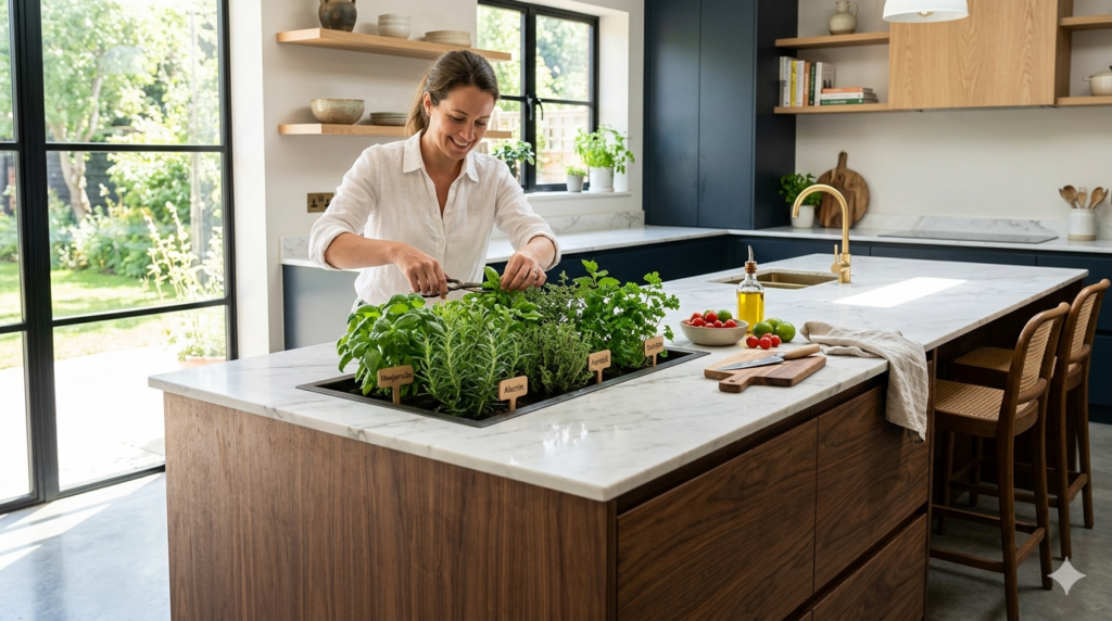 Uma das tendências mais fortes no design de cozinhas de luxo é a “ilha viva”. Trata-se de uma calha técnica esculpida diretamente no material da bancada (pedra ou aço inox) onde os vasos de temperos são colocados.
